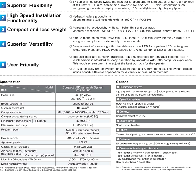 Compact but with 800×360 mm long board size capacity, the JX-100 LED is a low cost placement solution for notebook PCs, LCD monitors, and a wide variety of lighting equipment.